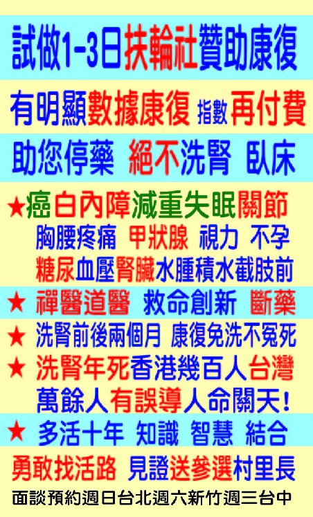 癌症 洗腎 O元收費:分期十年10期收費,因死亡率超高,在台灣創新療法,力求與香港,日本同步技術療效,見證人數,廣傳救人一命,勝造,,勝捐,,行善!參選人大力推荐,